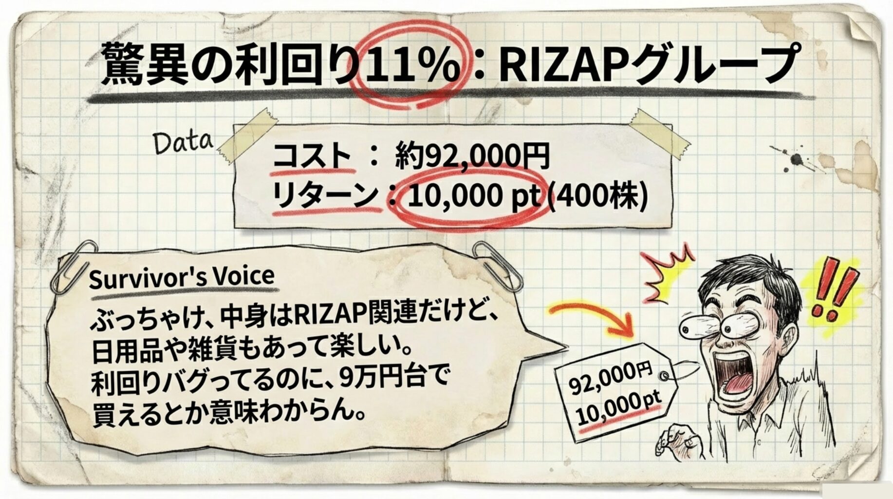 🎤 ぶっちゃけ、中身はRIZAP関連商品だらけだけど、日用品や雑貨もあって選ぶのは楽しい。利回りバグってる(約11%)のに、9万円台で買えるとか意味わからん。