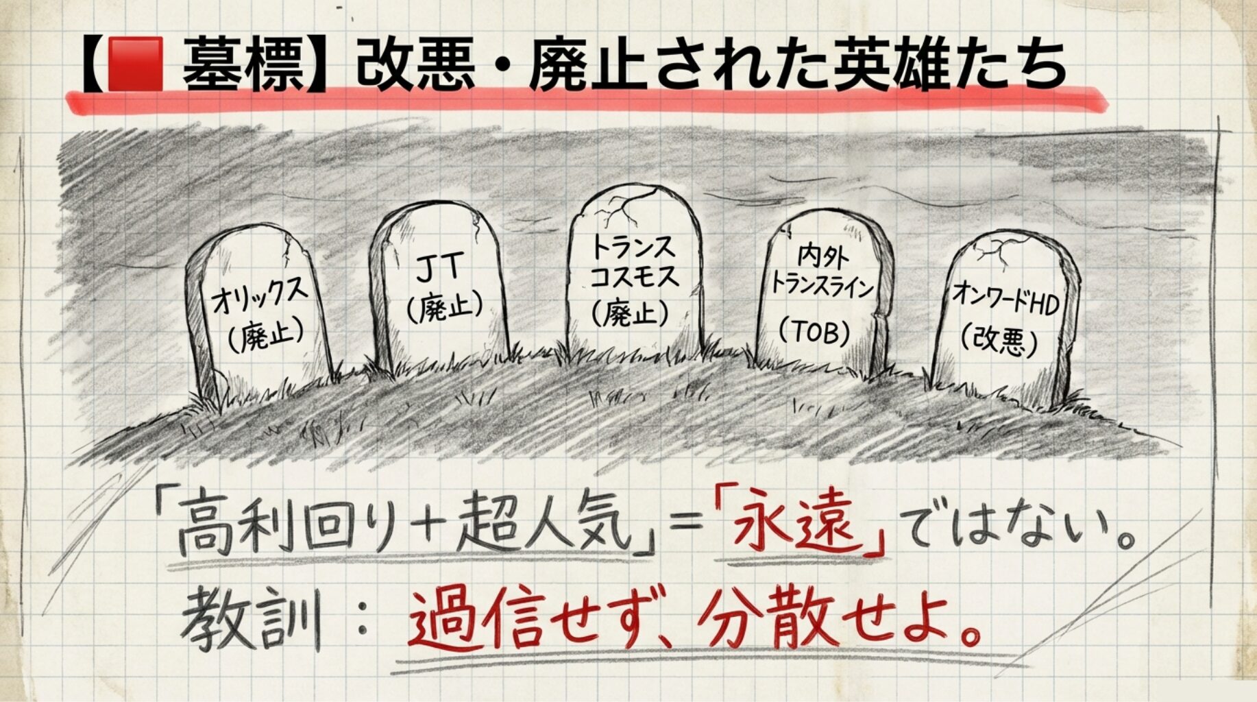 そして、「これやられたらキツい…」っていう、改悪・廃止5銘柄の“墓標”も立てておく。