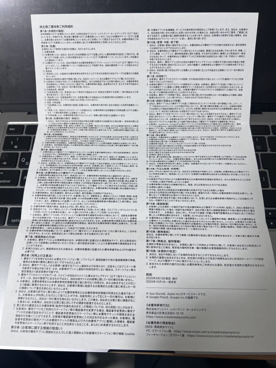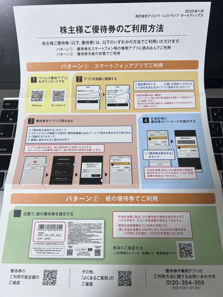 2025年11月14日、クリレスから最新の株主優待4,000円分が届きました!