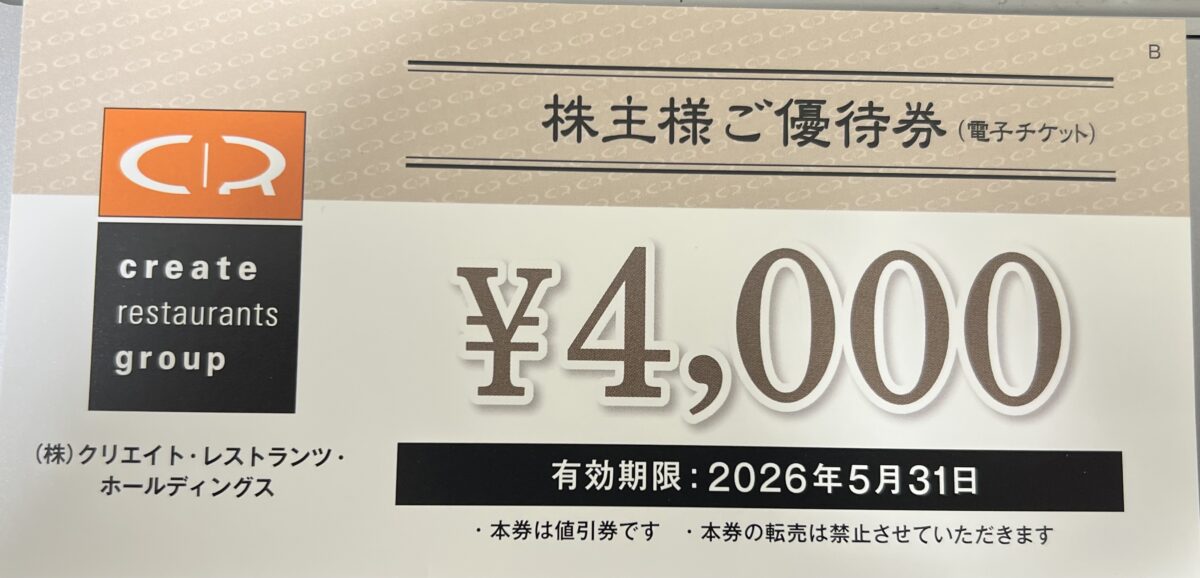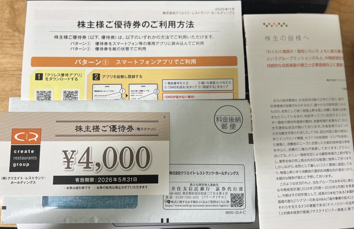 2025年5月中旬、クリエイト・レストランツ・ホールディングス(通称クリレス)から株主優待が届きました!