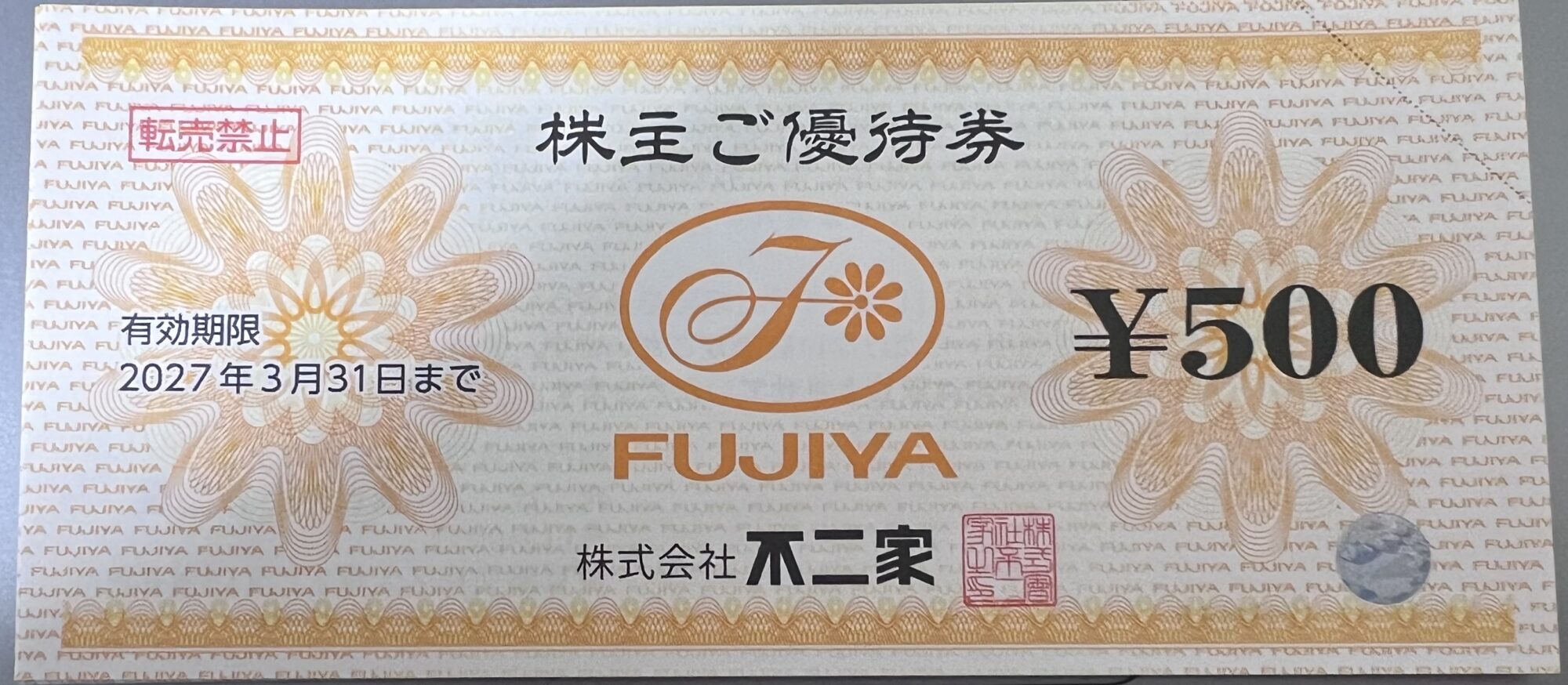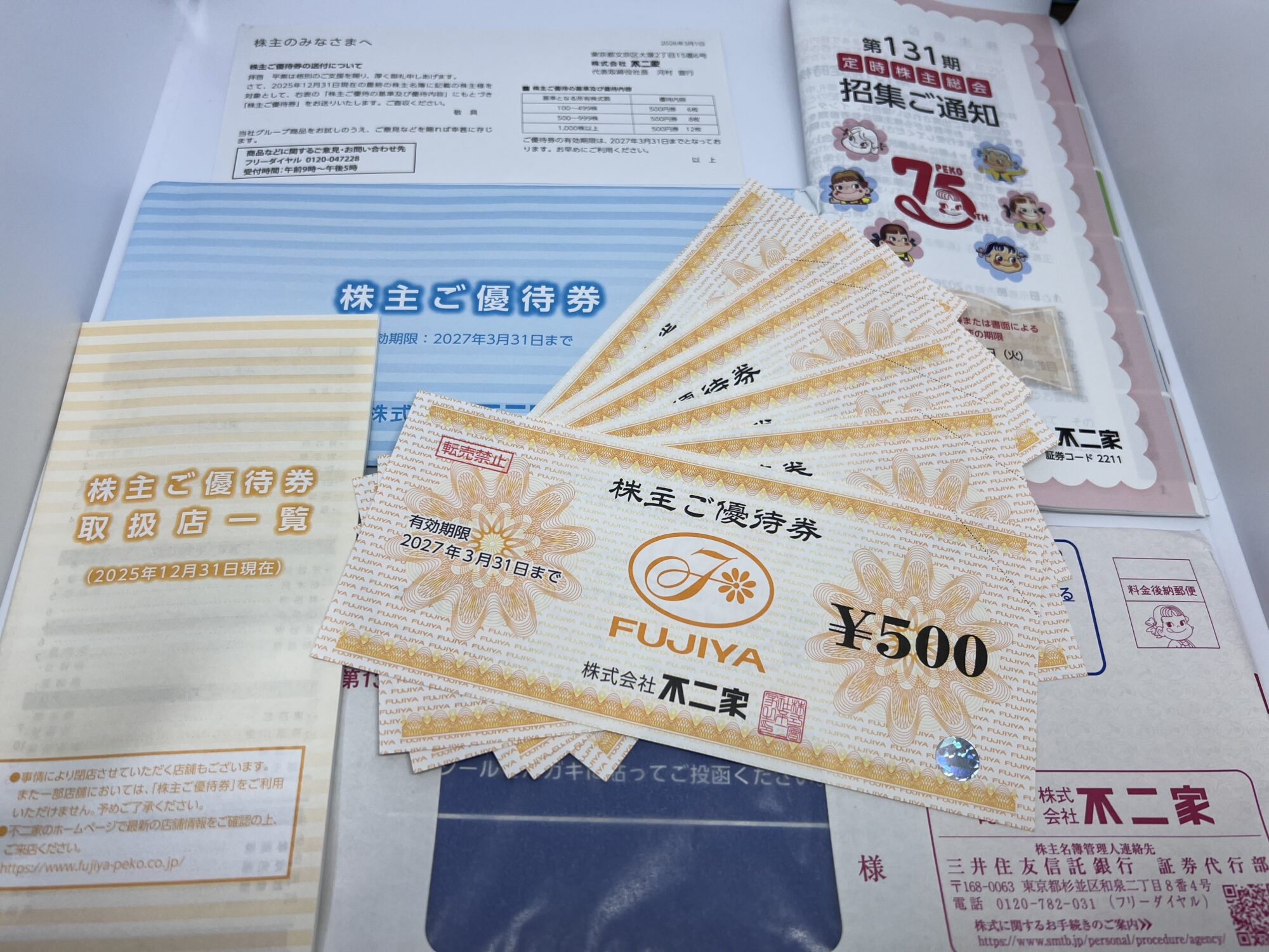 中に入っていたのは、500円券×6枚、合計3,000円分の「株主ご優待券」。有効期限は2027年3月31日まで。