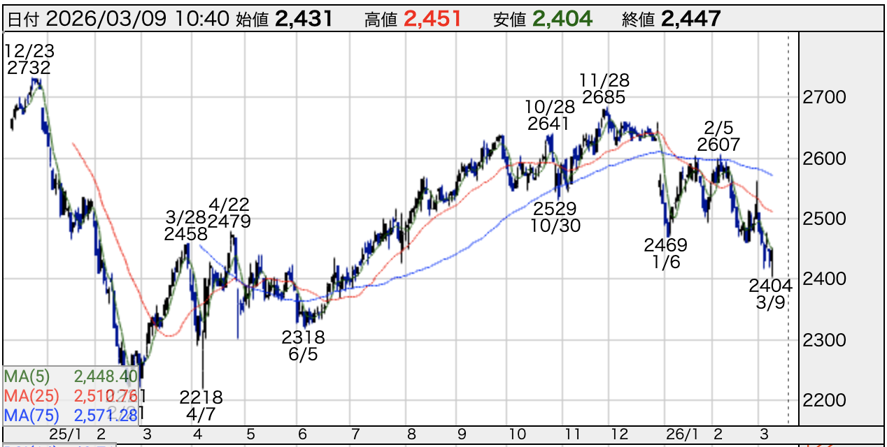 株価は概ね2,500〜2,700円のレンジで推移しており、大きなボラティリティはありません。