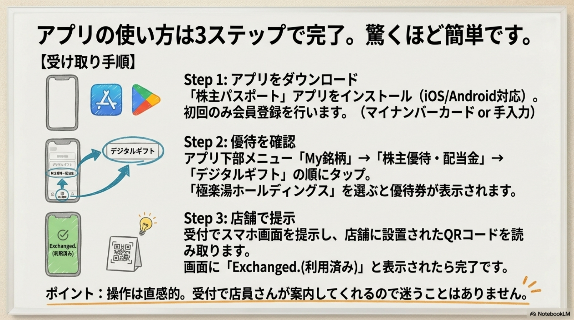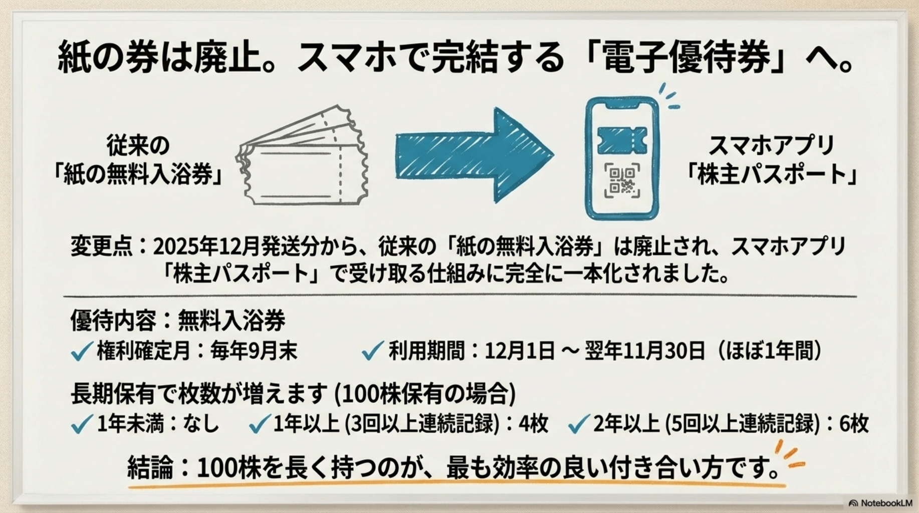 従来の紙の無料入浴券は廃止され、スマホアプリ「株主パスポート」で受け取る仕組みに一本化されました。