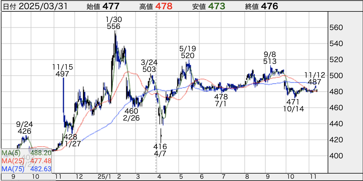 - 株価:482円(2025/11/13時点)