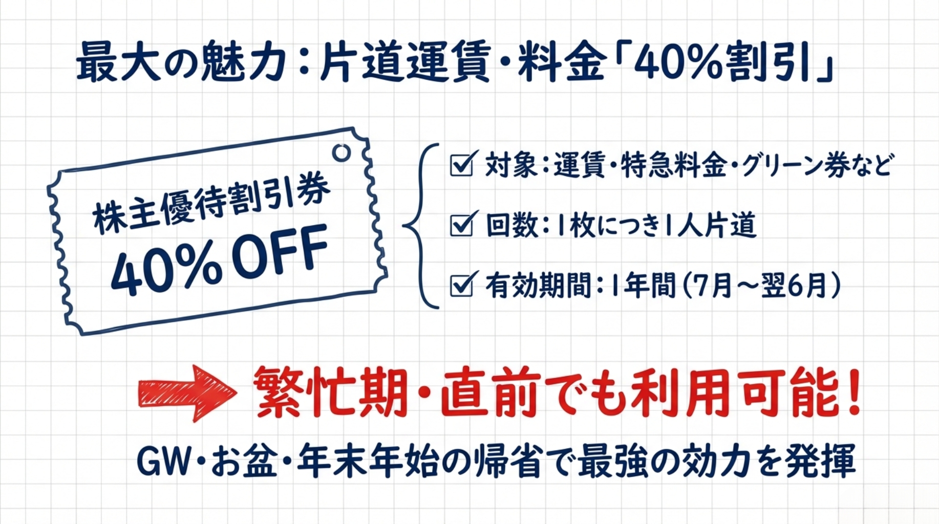 👉 特に GW・お盆・年末年始の帰省 では、割引きっぷが売り切れていても株主優待なら適用可能。これが最大の強みです。