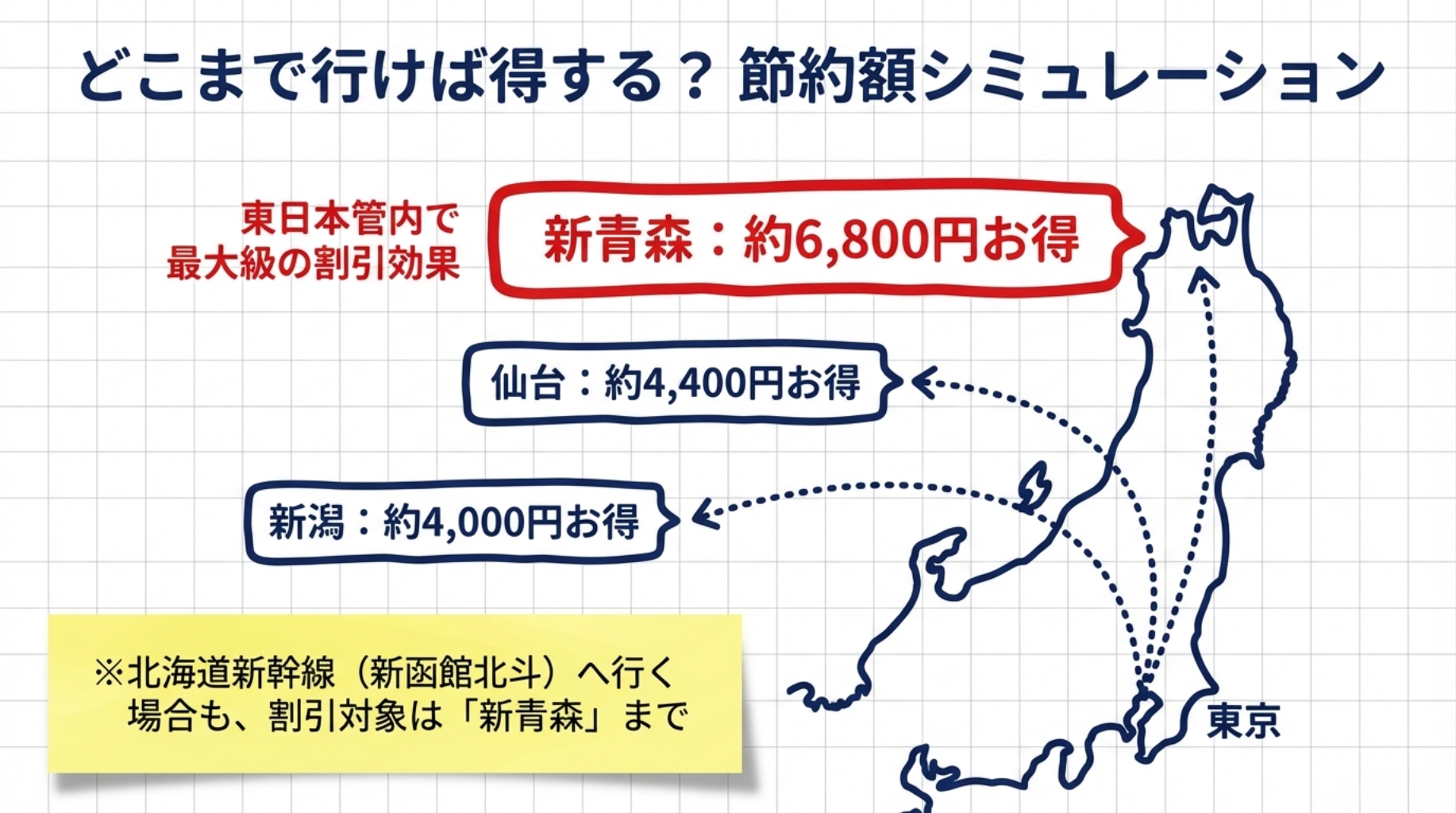 もし「東京⇄新青森」や「東京⇄盛岡」を毎年使うなら、優待1回で数千円〜1万円以上の節約が可能です。