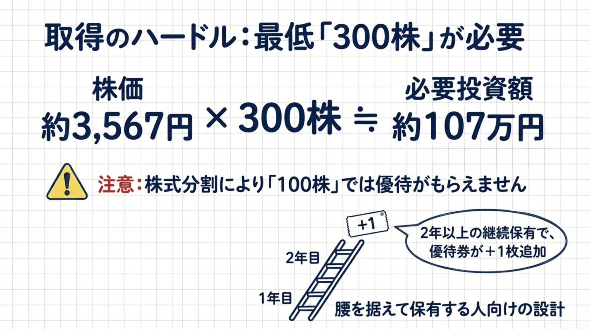 取得は300株〜(約107万円必要)とハードル高め。少額優待狙いなら他銘柄が無難。