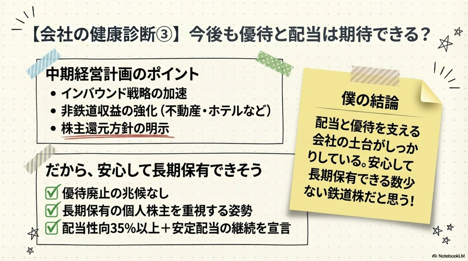 • 配当・優待を支える土台がしっかりしているため、「安心して長期保有」できる数少ない鉄道株