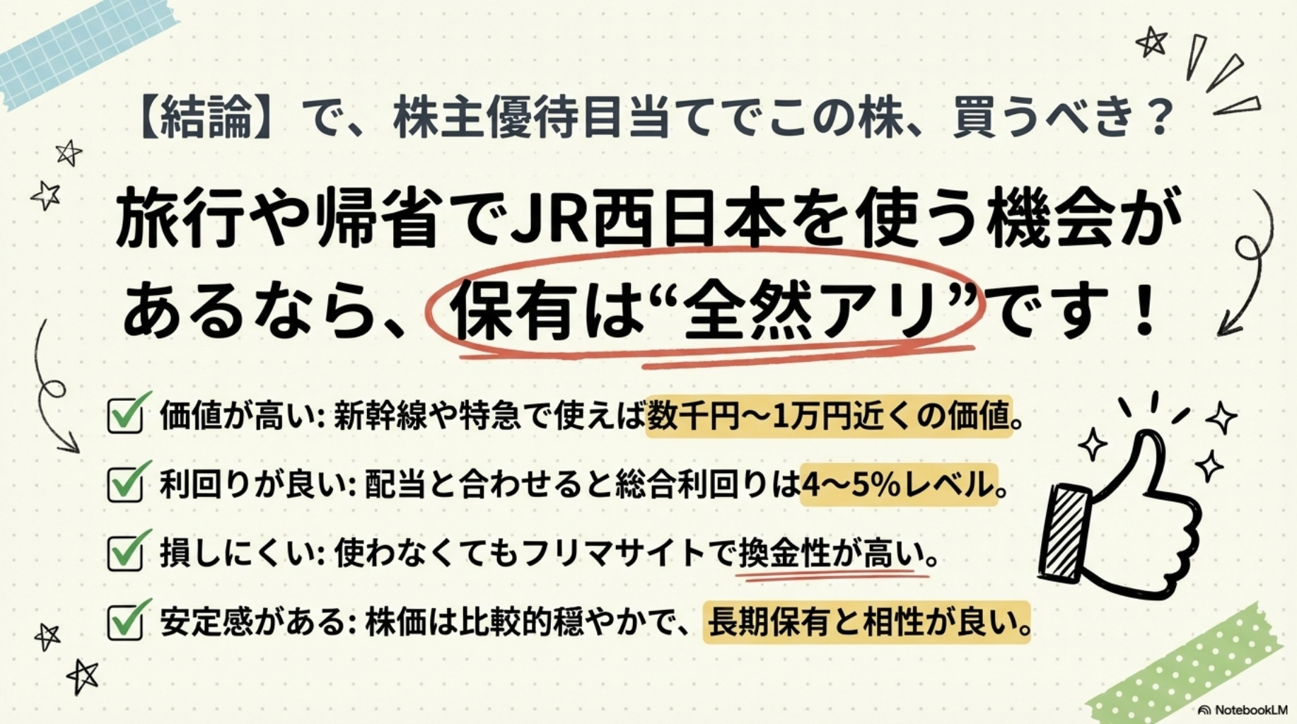 少しでもJR西日本を使う機会があるなら、この優待は十分すぎる“持つ理由”になります。