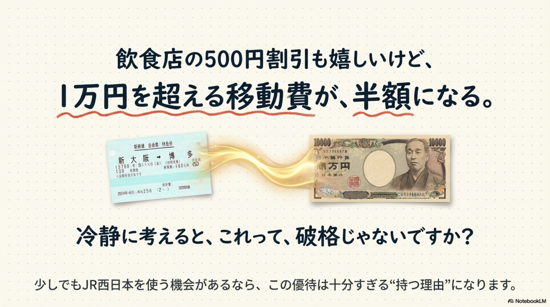 「飲食系の500円割引も嬉しいけど、1万円の移動費が半額になるって、冷静に考えて破格じゃないですか?」