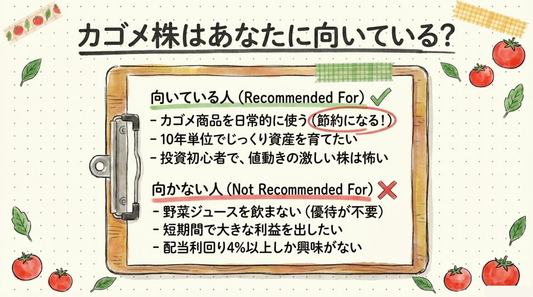 ここではカゴメの株主優待と株式が“向いている人/向かない人”をタイプ別に整理します💡