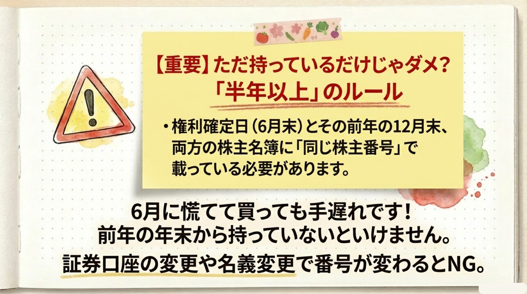 ここでは、優待をもらうために必要な条件・タイミング・注意点を初心者向けにわかりやすくまとめます✨