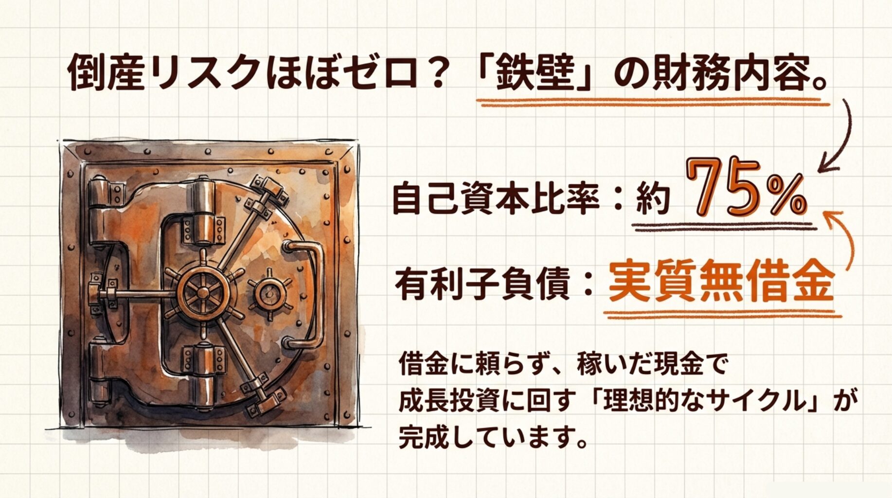 - 自己資本比率75% → 「倒産リスクほぼゼロの鉄壁財務」