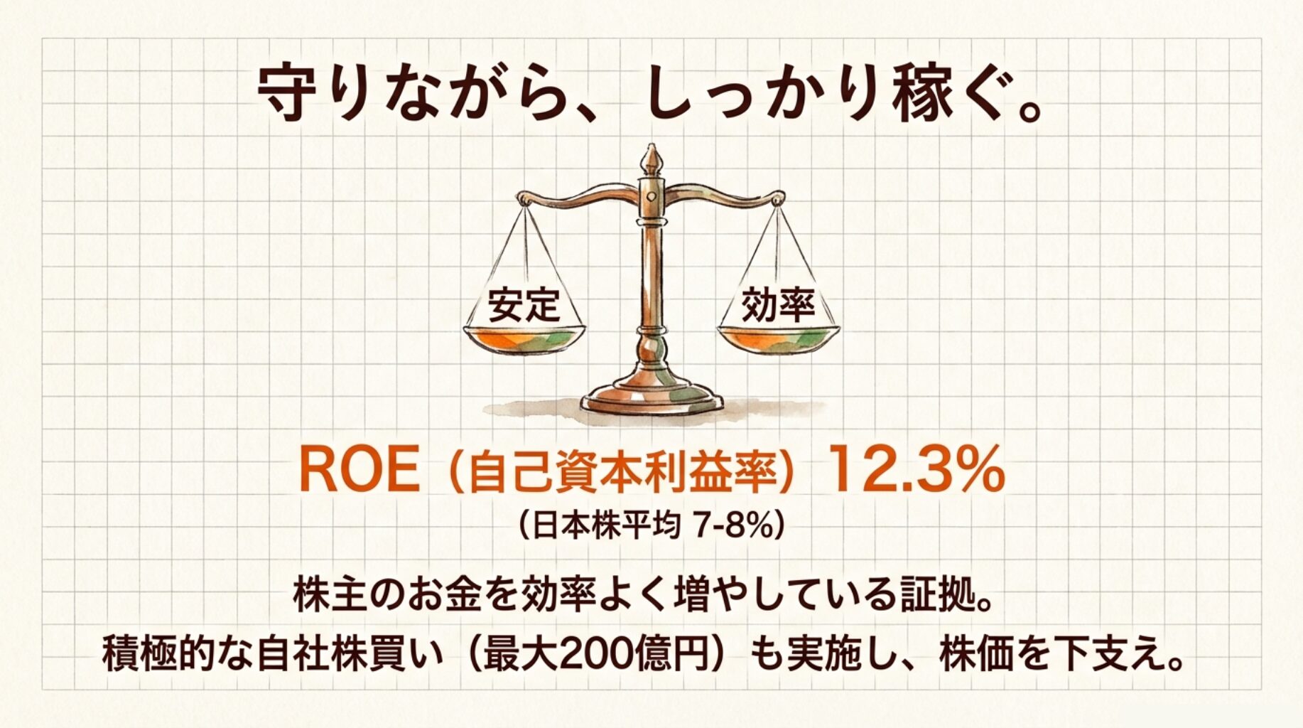- ROE(自己資本利益率)12%超 → 「効率よく利益を出せている」