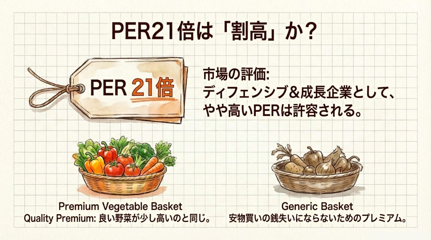 - PER(株価収益率)21倍 → 「成長企業の平均的な水準」
