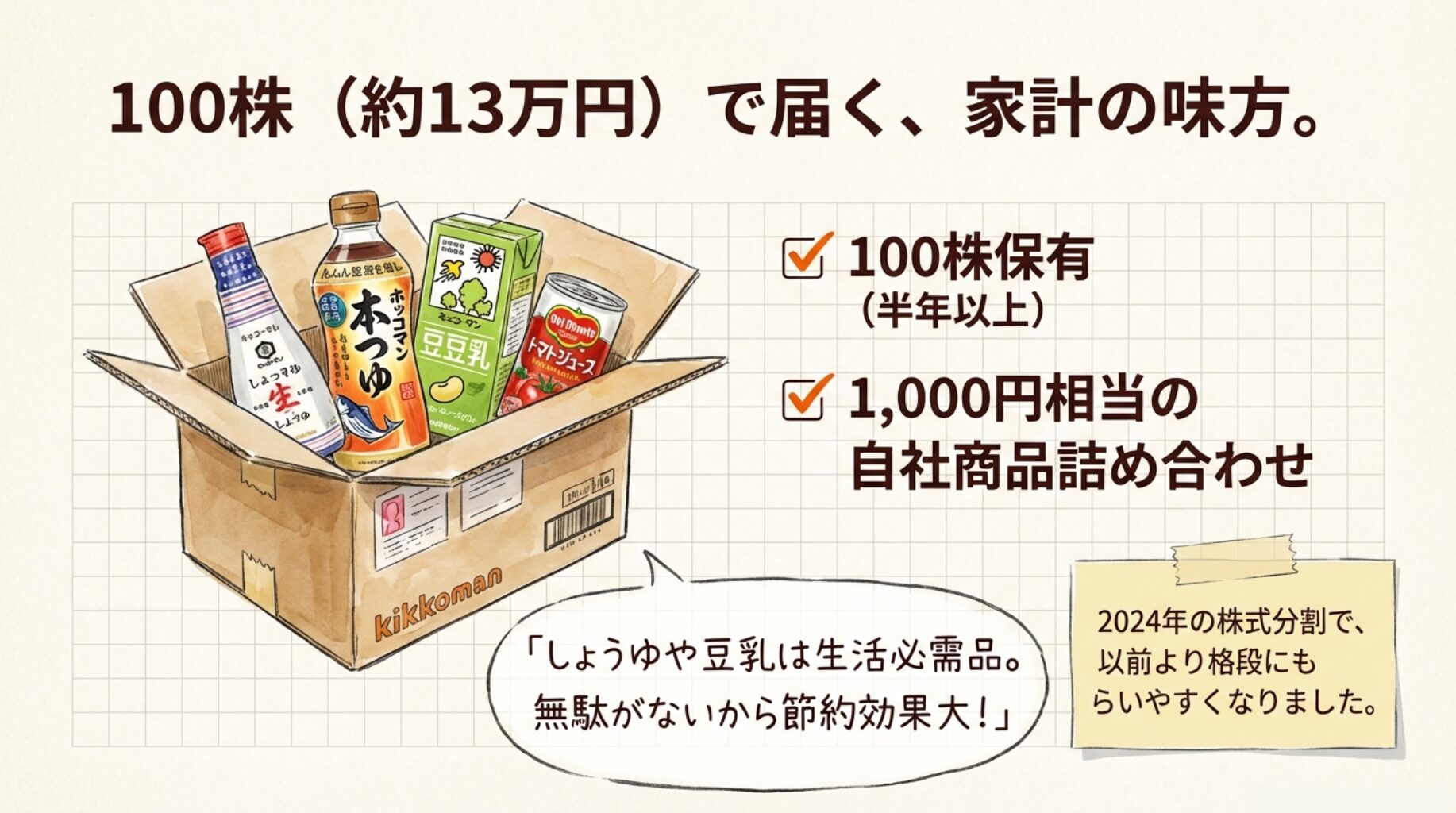 2024年の株式分割で、キッコーマンの優待は大きく変わりました。
