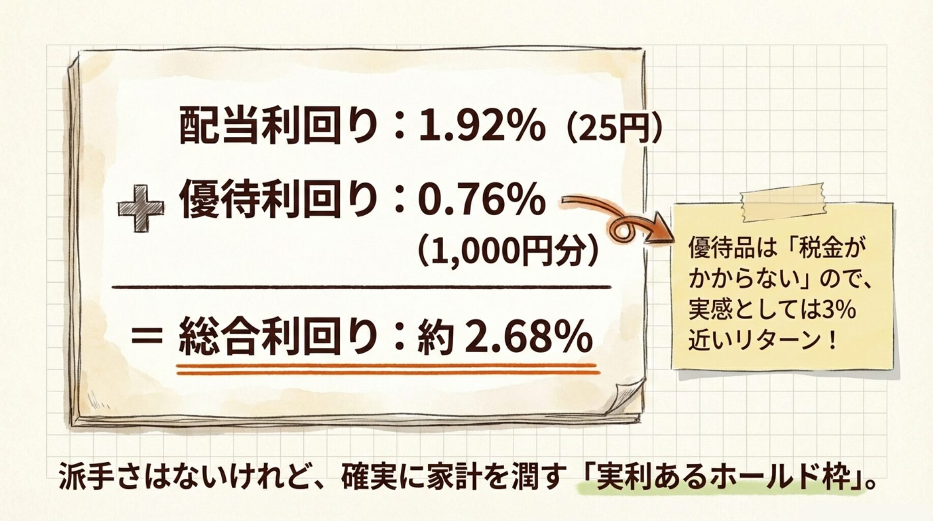 | 📊 総合利回り | 約2.68%(優待が非課税のため、実質3%近い手取り感) |