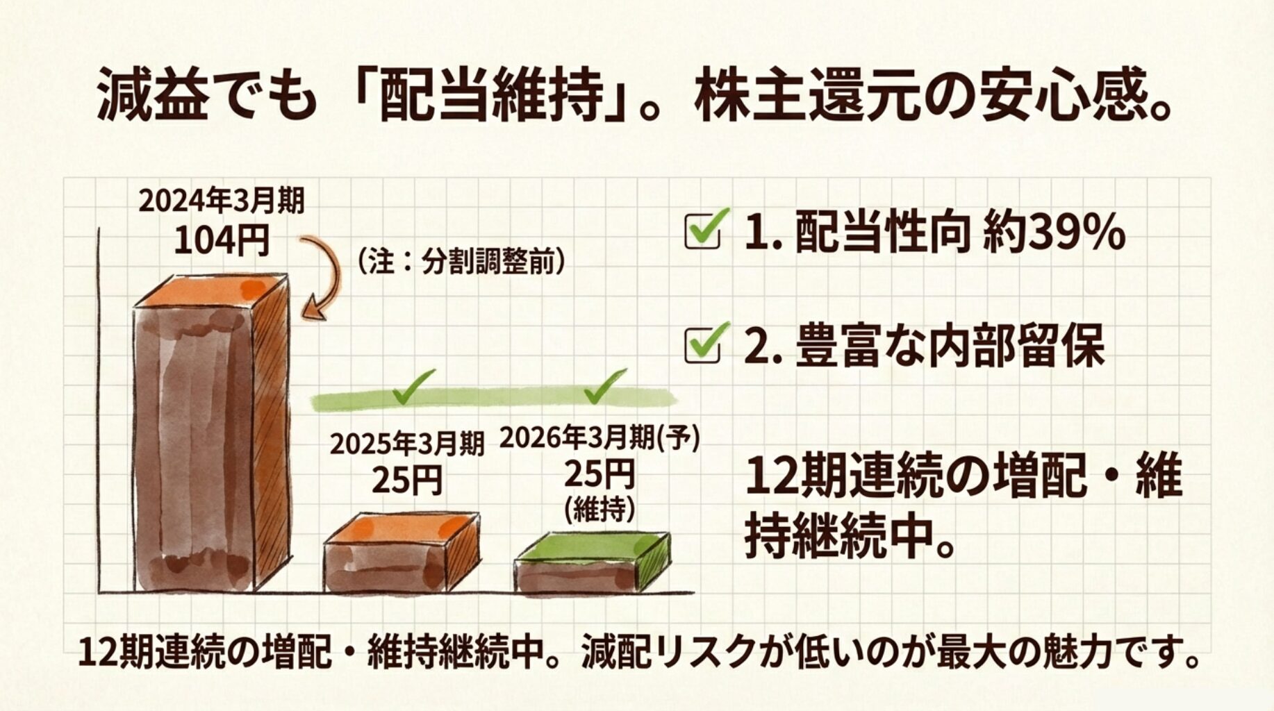 👉そのため、2026年3月期は減益予想でも25円を維持予定。