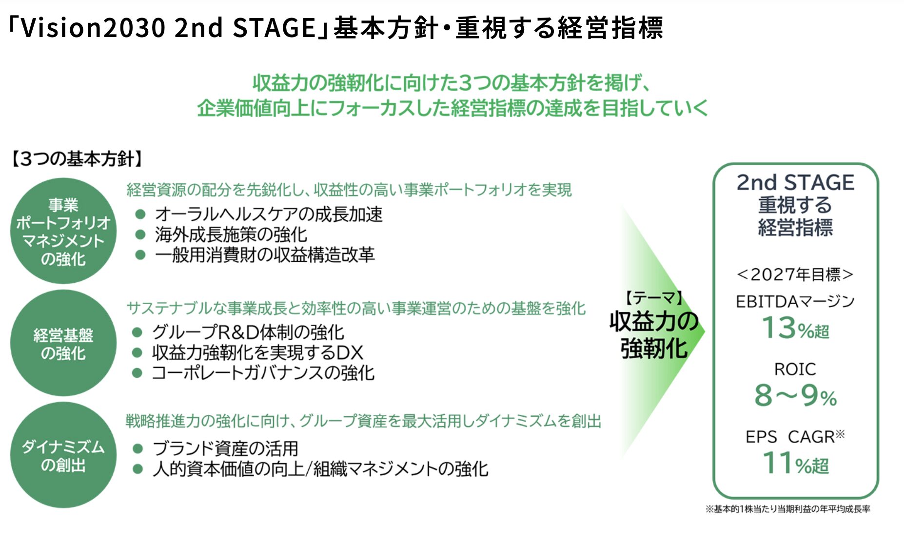 「虫歯・歯周病予防」から「口腔起点の美容・健康」まで領域を拡張し、単価の高い製品群を育成する戦略です。