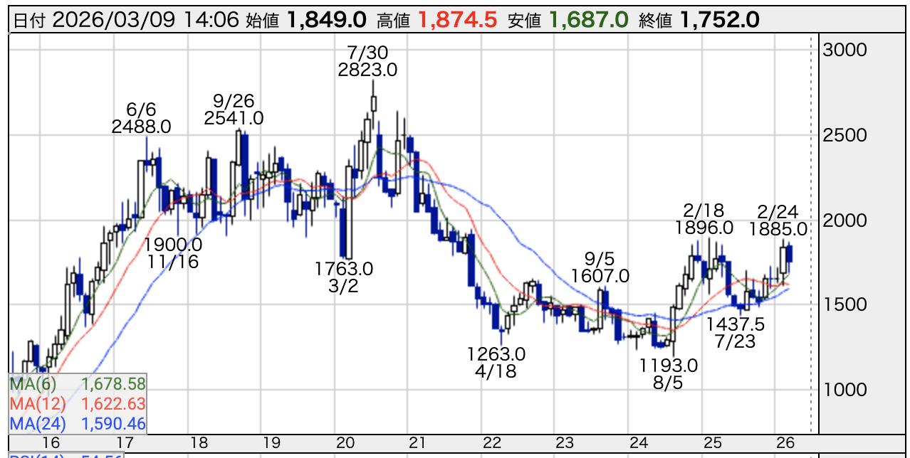 2025年は1,438〜1,896円のレンジで推移し、2026年3月現在は1,750円前後で落ち着いています。