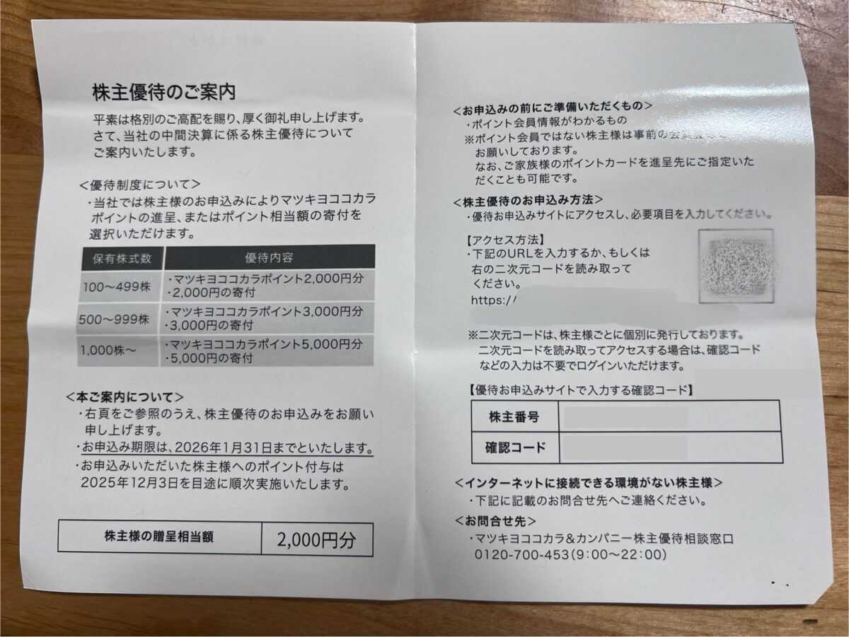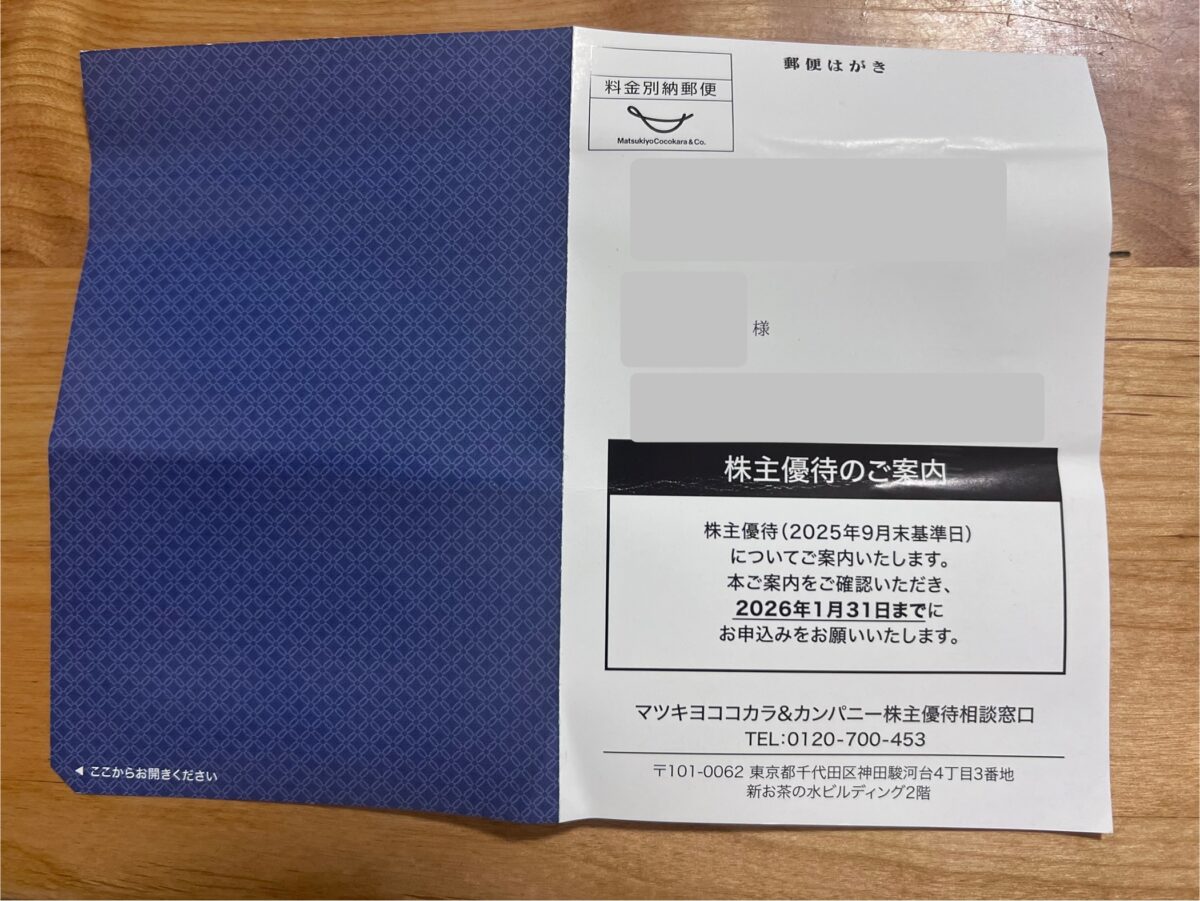 【マツキヨココカラ&カンパニー(証券コード:3088)】から届いた株主優待を実際に申し込んでみたので、