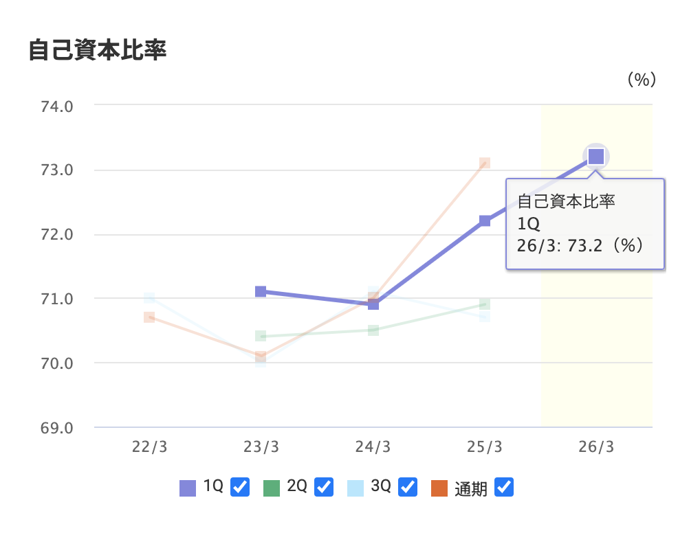 一般的に「50%以上で優良」と言われている中、70%超えは財務超優良企業クラス✨