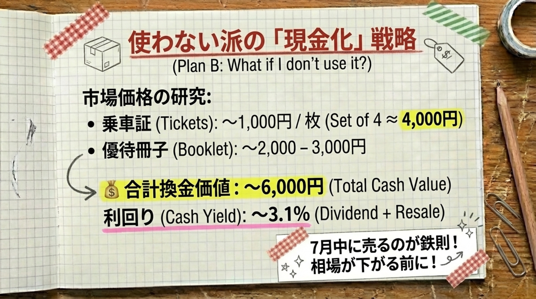 | 💴 換金ベース | 乗車証+冊子をラクマ・ヤフオクで合計6,000円相場で売却 | 約3.1% |