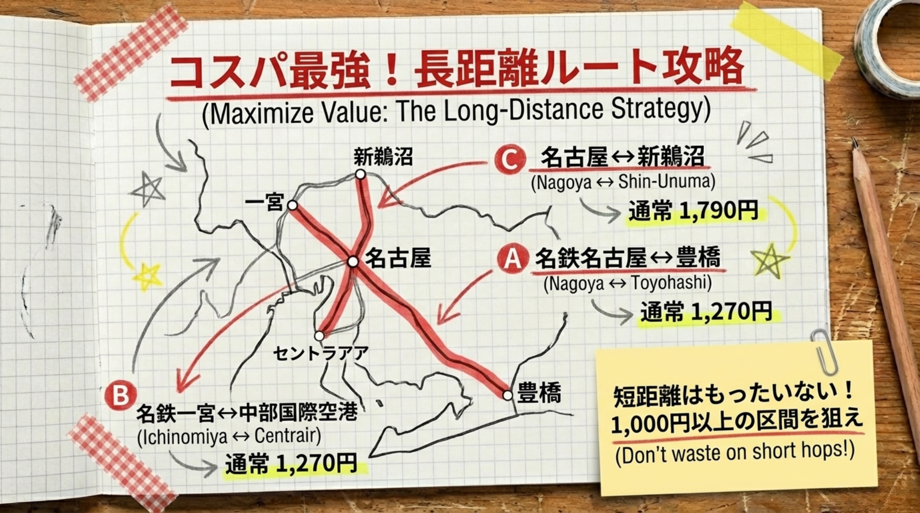 名古屋〜豊橋、一宮〜中部国際空港など、距離が長い区間ほどお得感があります。