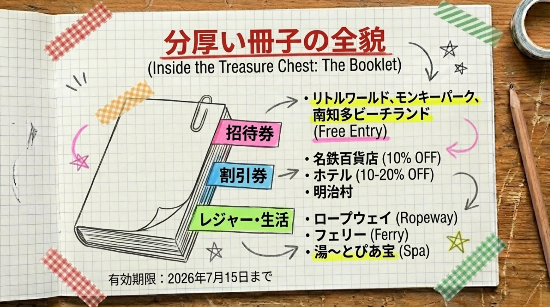 特に今年の冊子は、リトルワールド・モンキーパーク・明治村といったレジャー施設の無料招待券に加えて、百貨店・ホテル・観光施設・ロープウェイ・フェリーなど、ジャンルも豊富で使い勝手が良さそう。