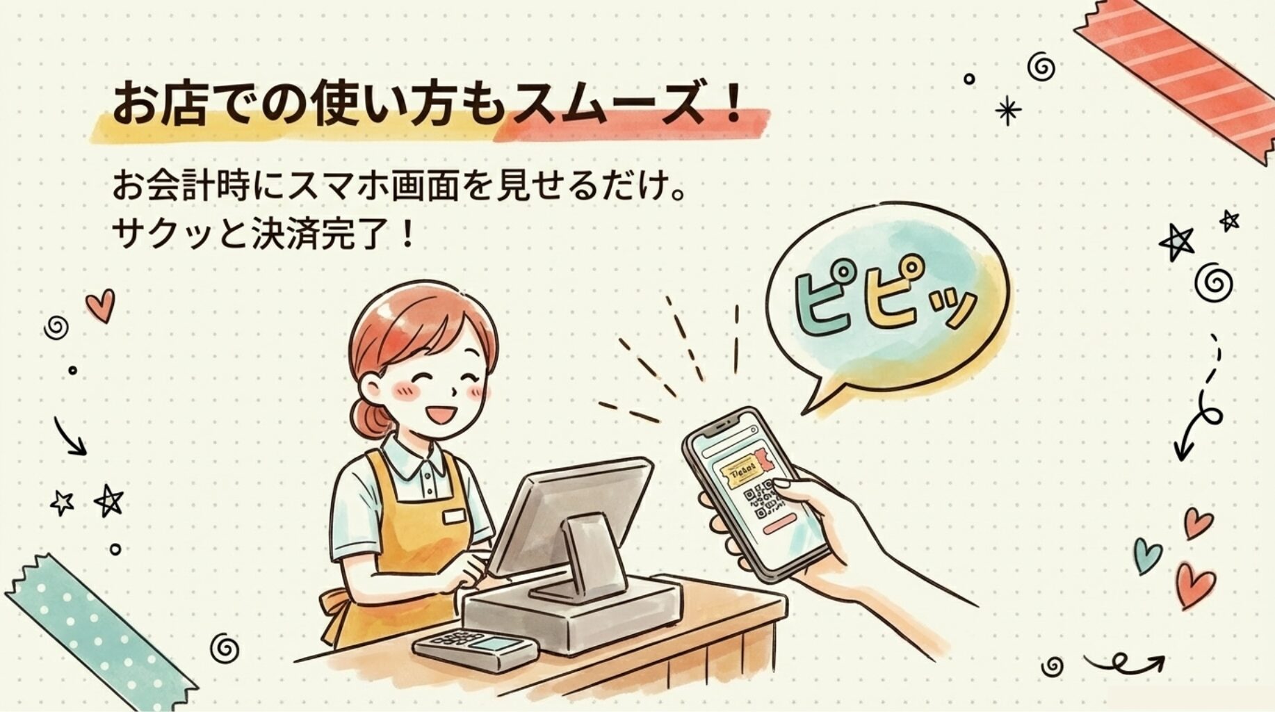 - 店舗レジのスキャナーにスマホ画面のバーコードを提示する