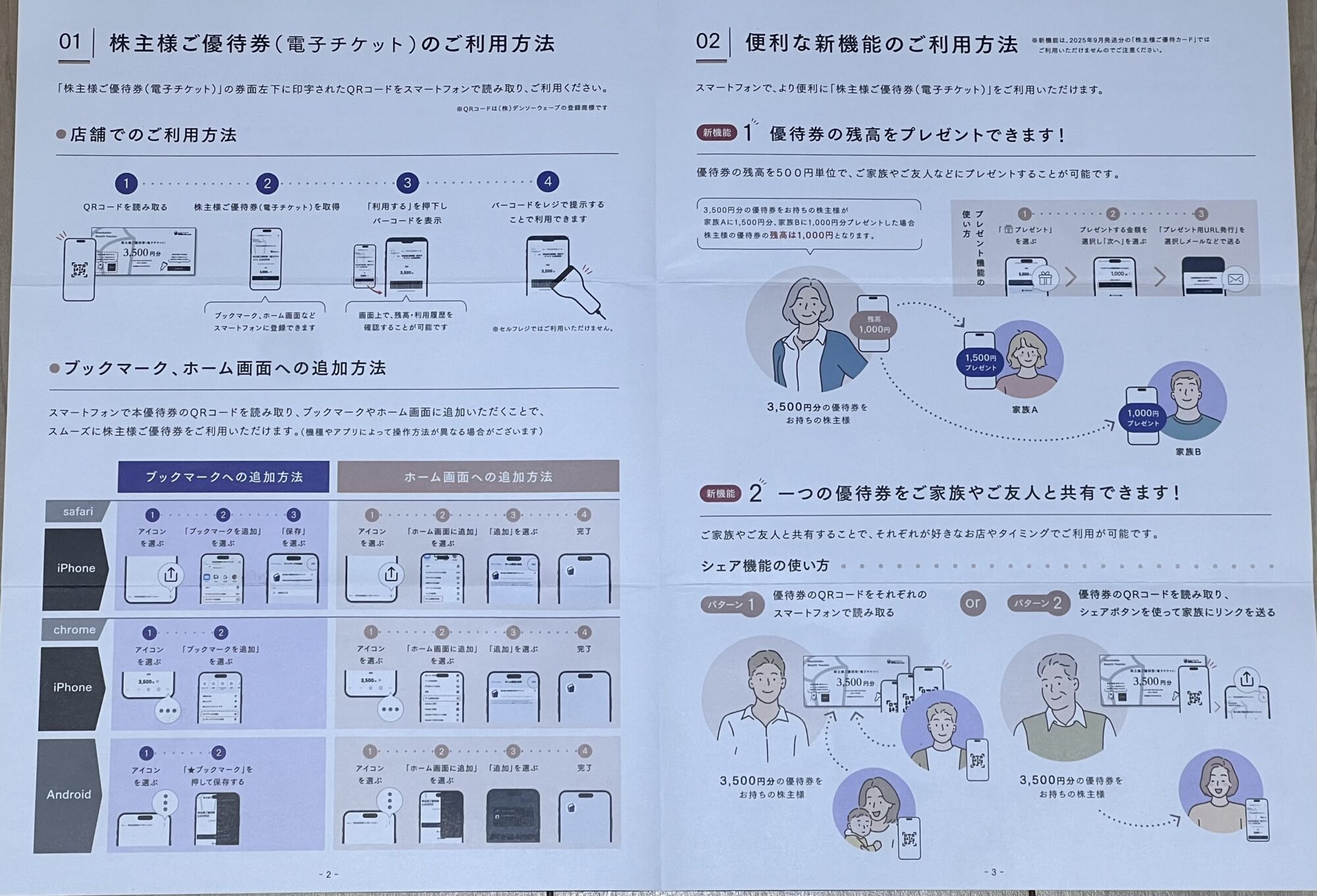 優待券のQRコードをそれぞれのスマホで読み取る方法と、シェアボタンでリンクを送る方法があります。