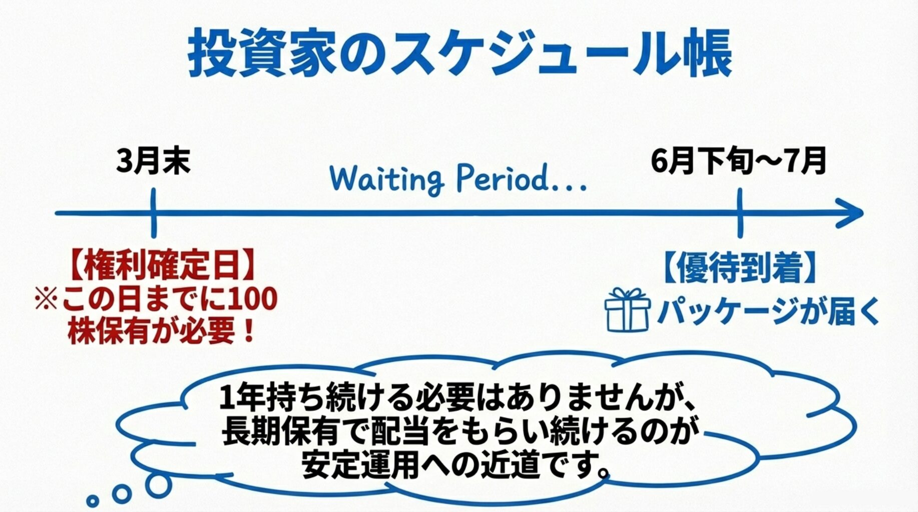 A:🗓 毎年3月末時点で100株以上保有していればOKです。