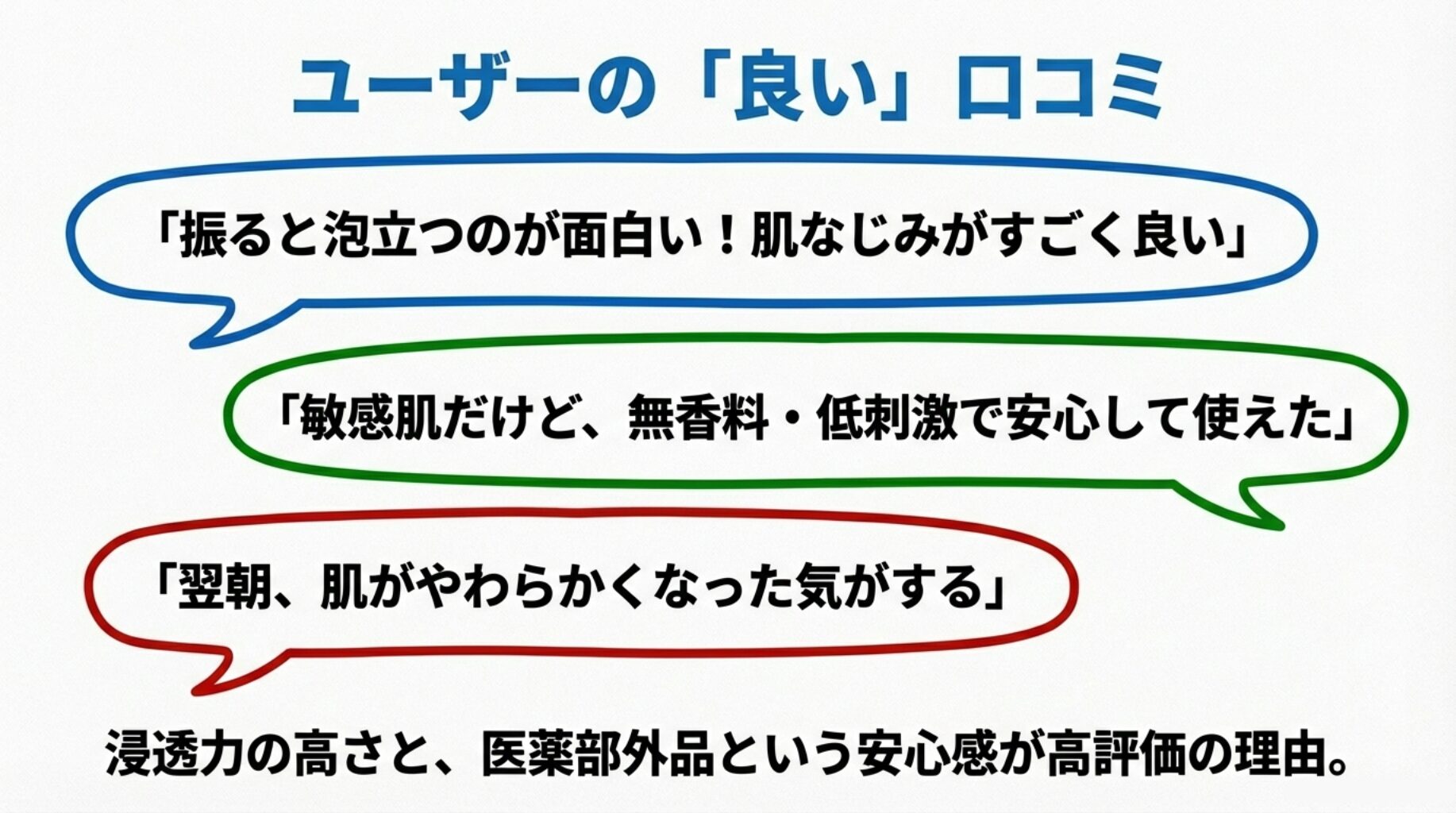 A:🧴 使用感は「しゅわしゅわの泡で肌に浸透してくる感じ」が特徴。