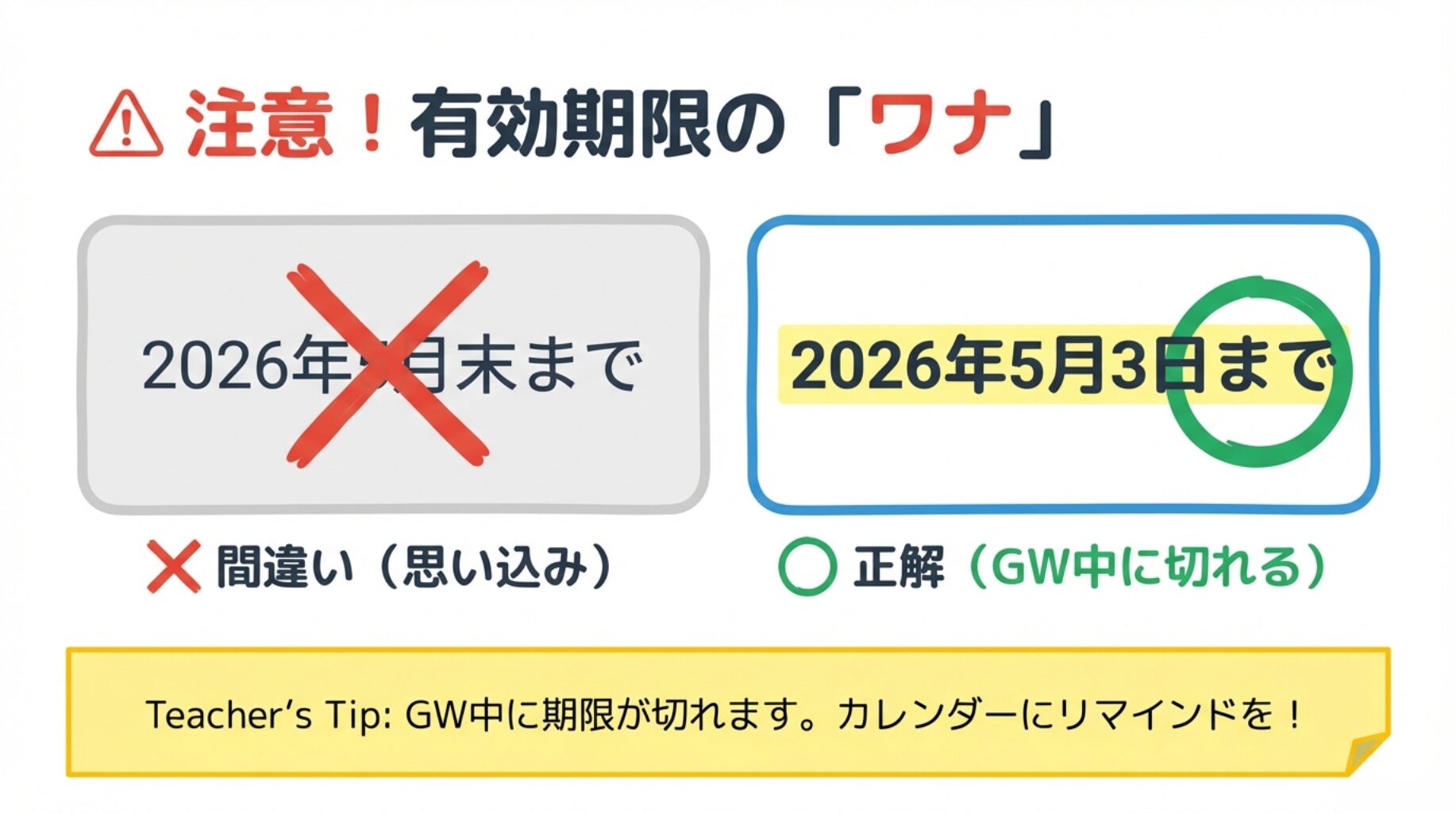 「5月末まで」と思い込みがちですが、実際は5月3日まで