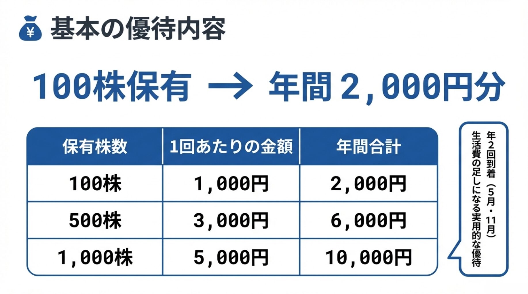 100株だけでも年2回で合計2,000円分もらえるので、実質“生活費の足し”になる優待です。
