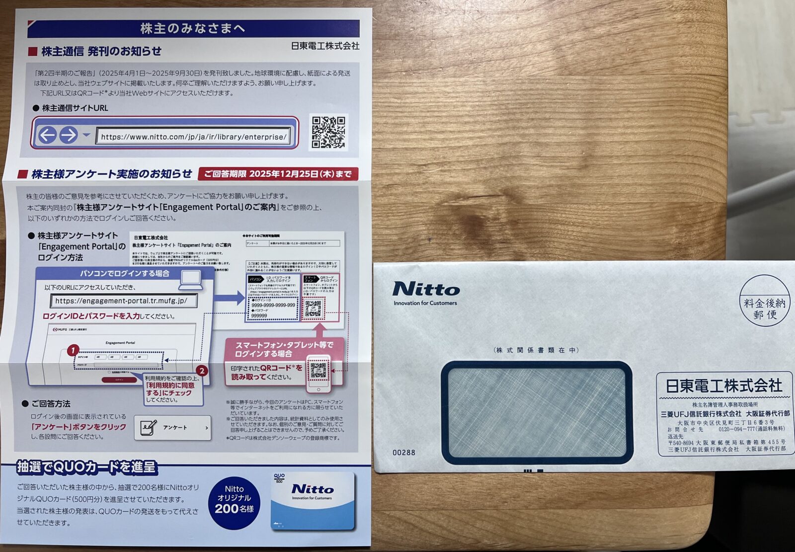 【隠れ優待?】日東電工の株主アンケート回答でQUOカード500円分が当たる|株式関係書類に同封【2025年】