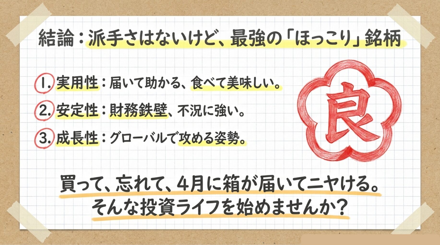🔚結論:派手さはないけど、持っててホッとする優待株!