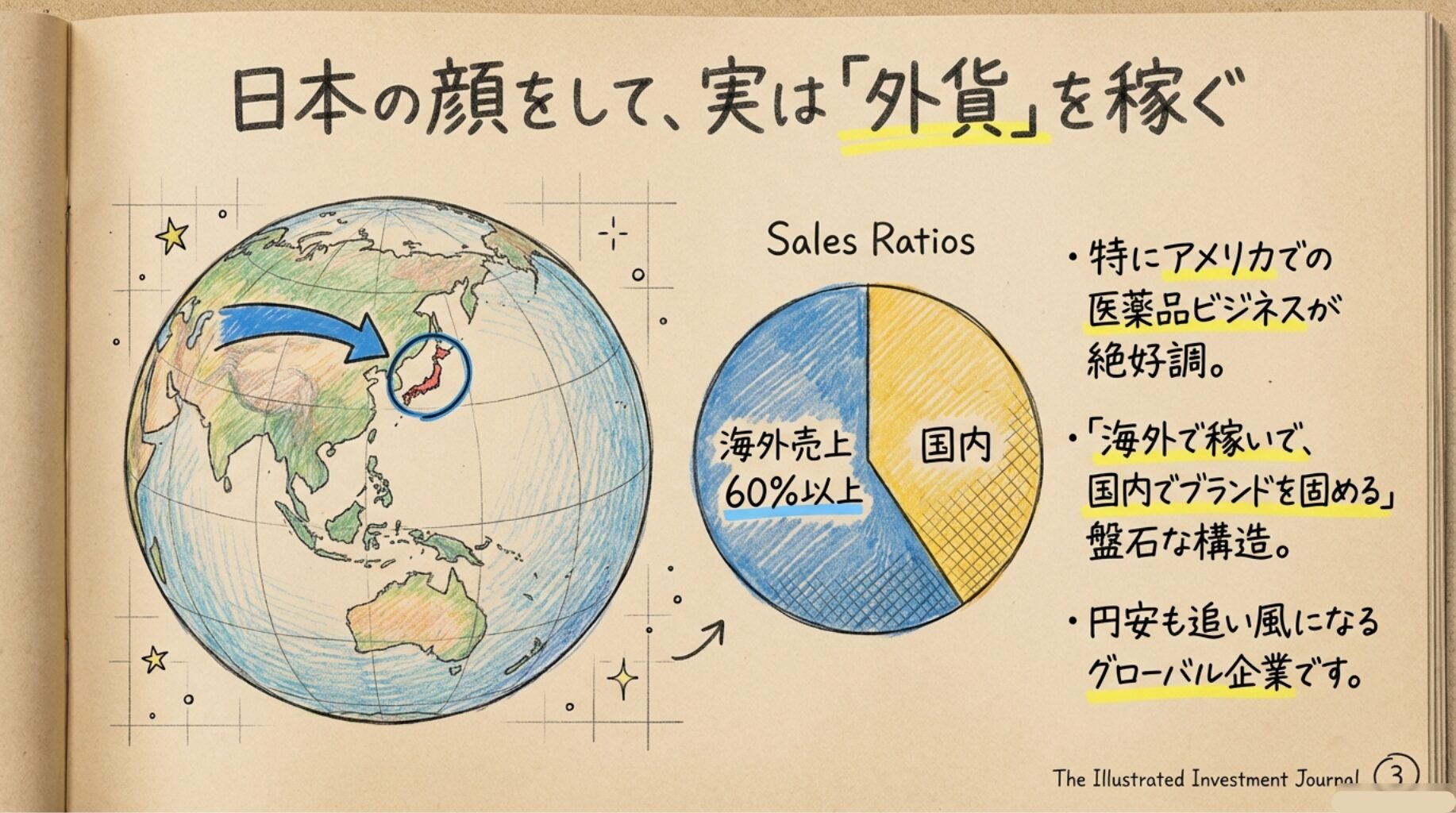 実は売上の6割以上が海外市場からのもので、特にアメリカでの医薬品ビジネスが大きく伸びています💹
