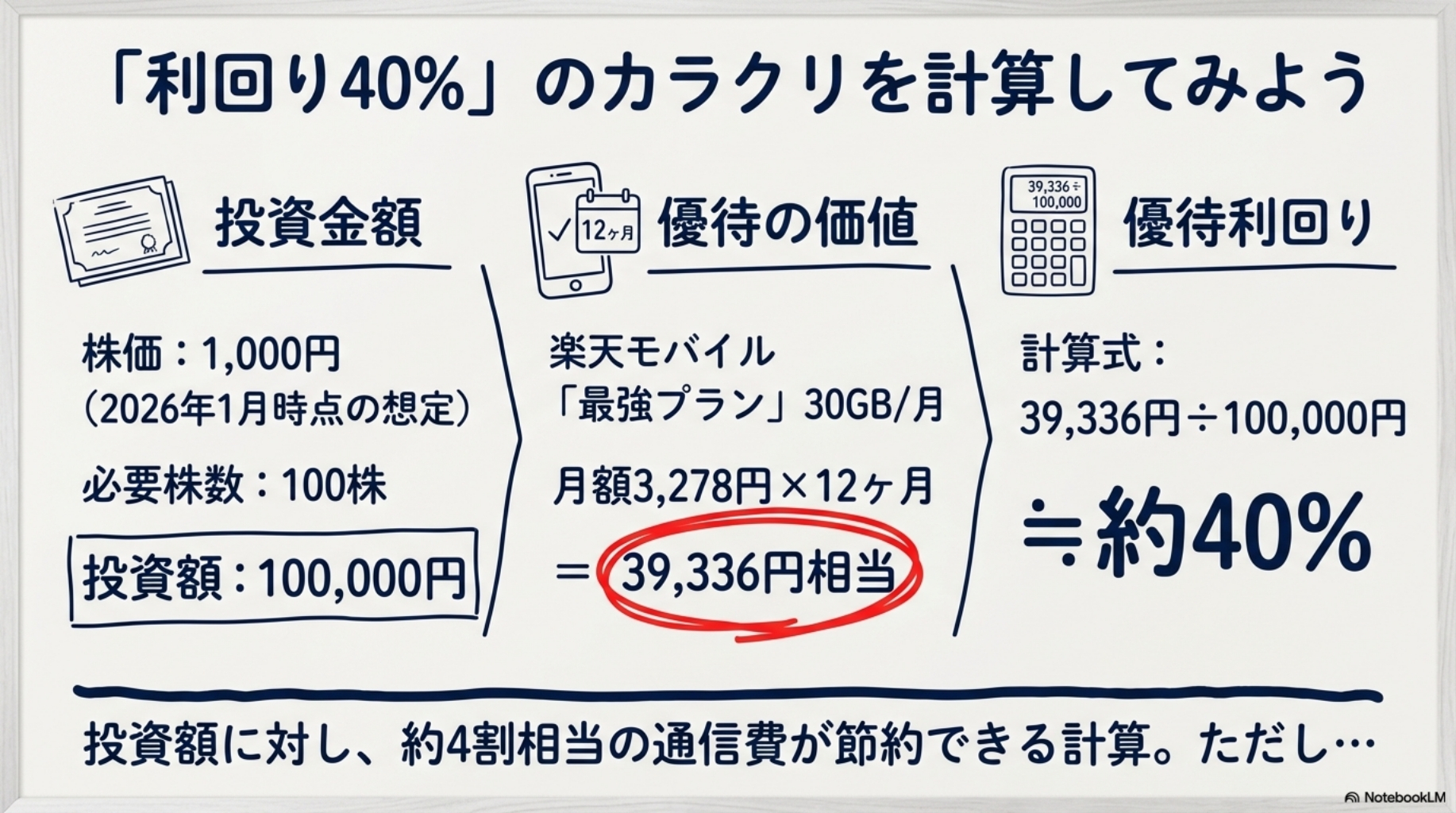 つまり、「楽天の株を持っていれば、スマホ代が1年間まるごと浮く」わけで、