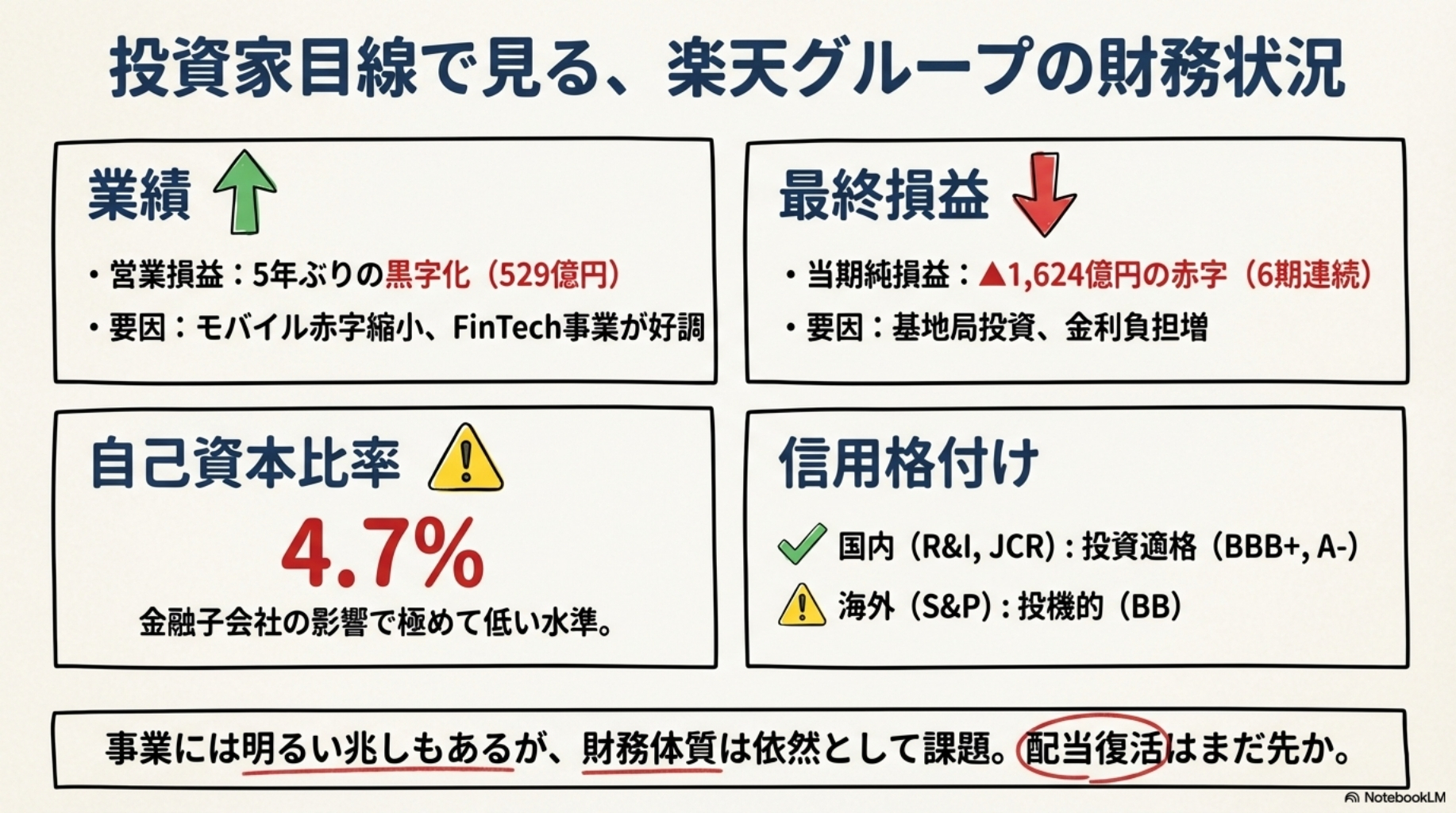 ▶ 楽天グループの公式ページを見る※株価・配当金・利回りなどの数値は、執筆時点の情報をもとに、Kabutan、Yahoo!ファイナンス・SBI証券・各社IR資料などを参考に筆者が独自に集計・算出したものです。市場の状況により変動するため、実際の投資判断はご自身で最新情報をご確認ください。