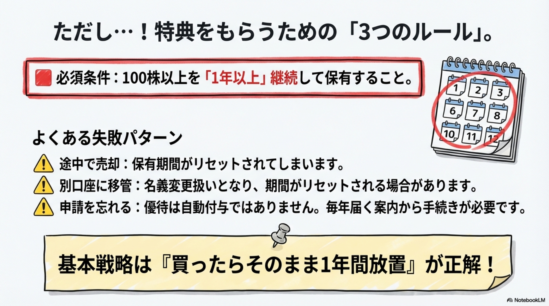 優待狙いなら、買ったら1年間は売らないのが鉄則です。忘れずに放置しておきましょう📲✨