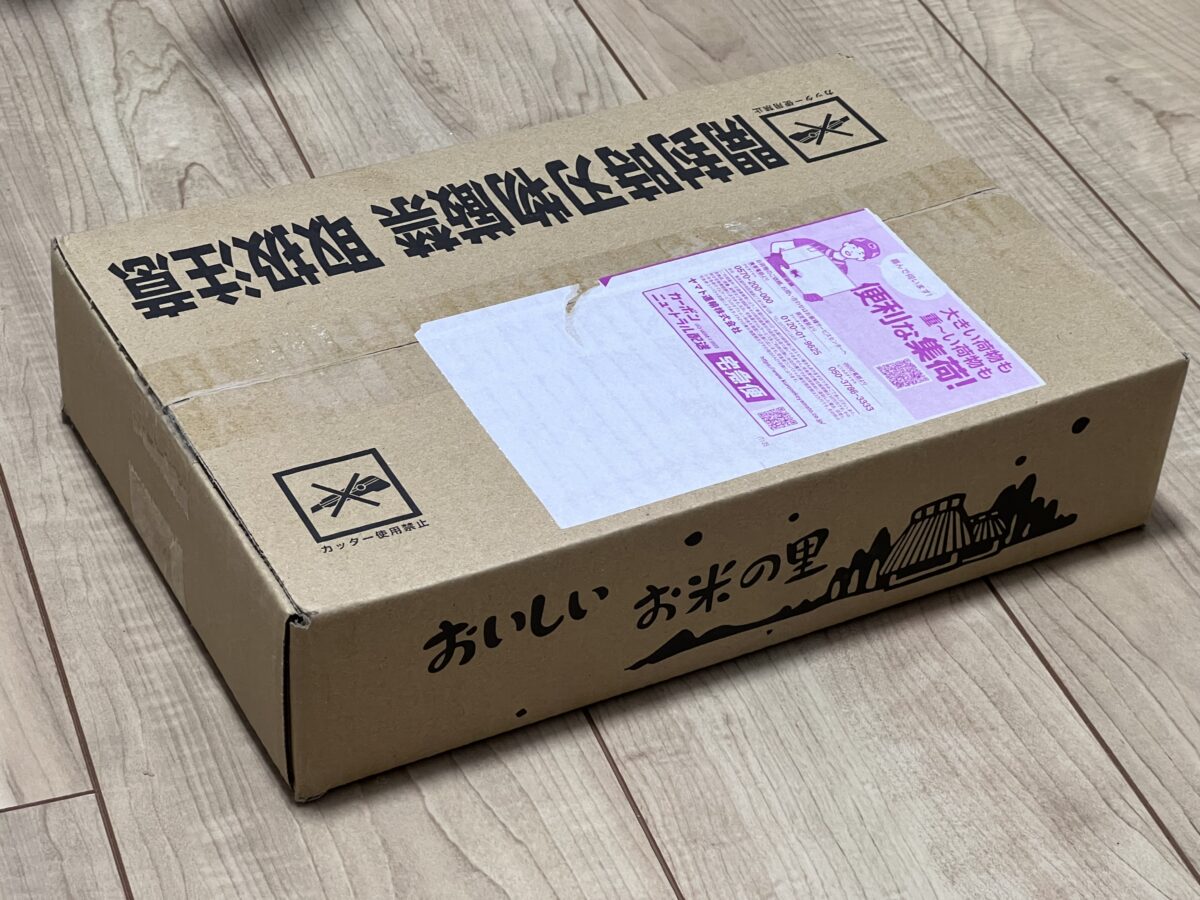 ↑ お米が届いた外箱。「おいしいお米の里」の文字が印象的✨