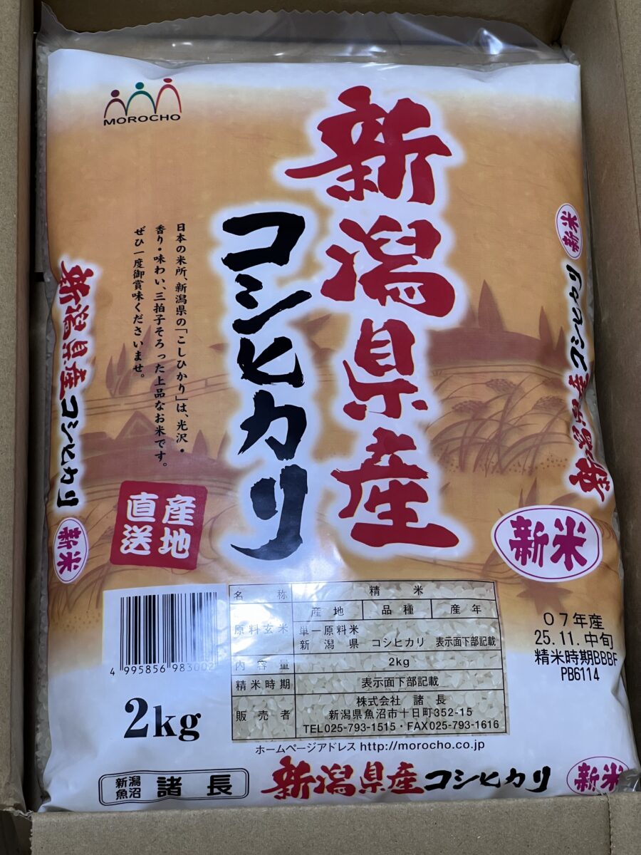 ↑ 内容物は新潟県産コシヒカリ2kg。パッケージも上品です。