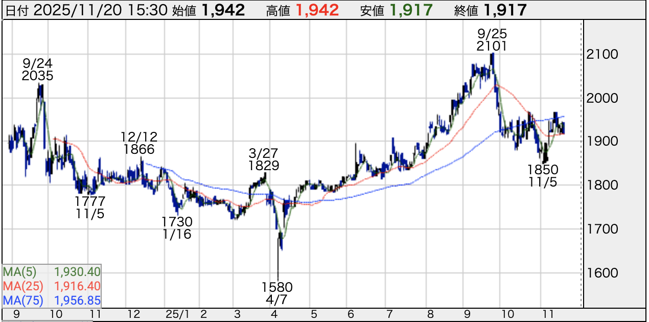その後は外部環境(米国株安など)の影響もあり、現在は1,900円前後で落ち着いています。
