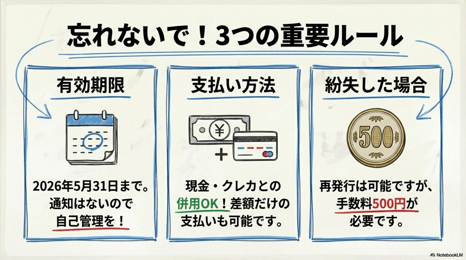 このあたりを読み飛ばしてしまうと、店頭で使えなかったり、期限切れになったりする可能性もあるので注意しましょう。