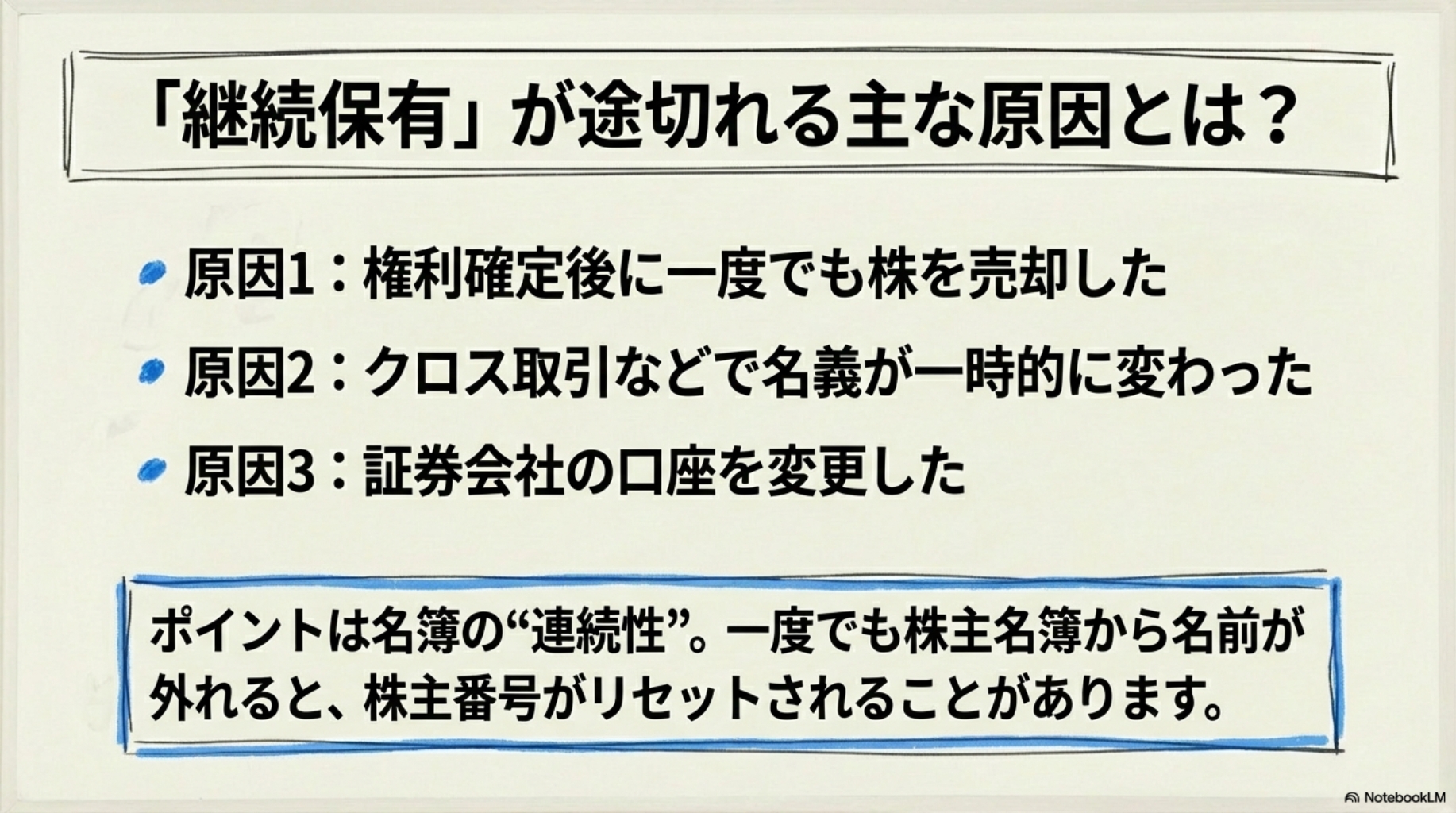 このように一度名義から株が外れる=継続保有リセットと判定されることがあります。