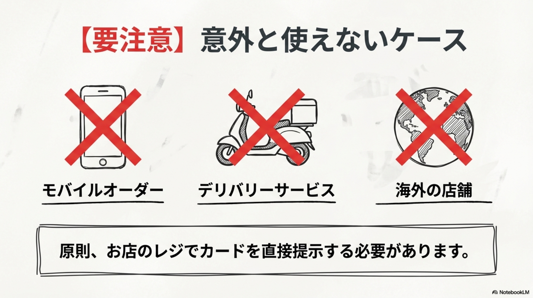 🙅♂️「えっ、スマホ注文でも使えないの!?」とよく驚かれますが、あくまで“レジ会計時にカードを提示”が必要です。