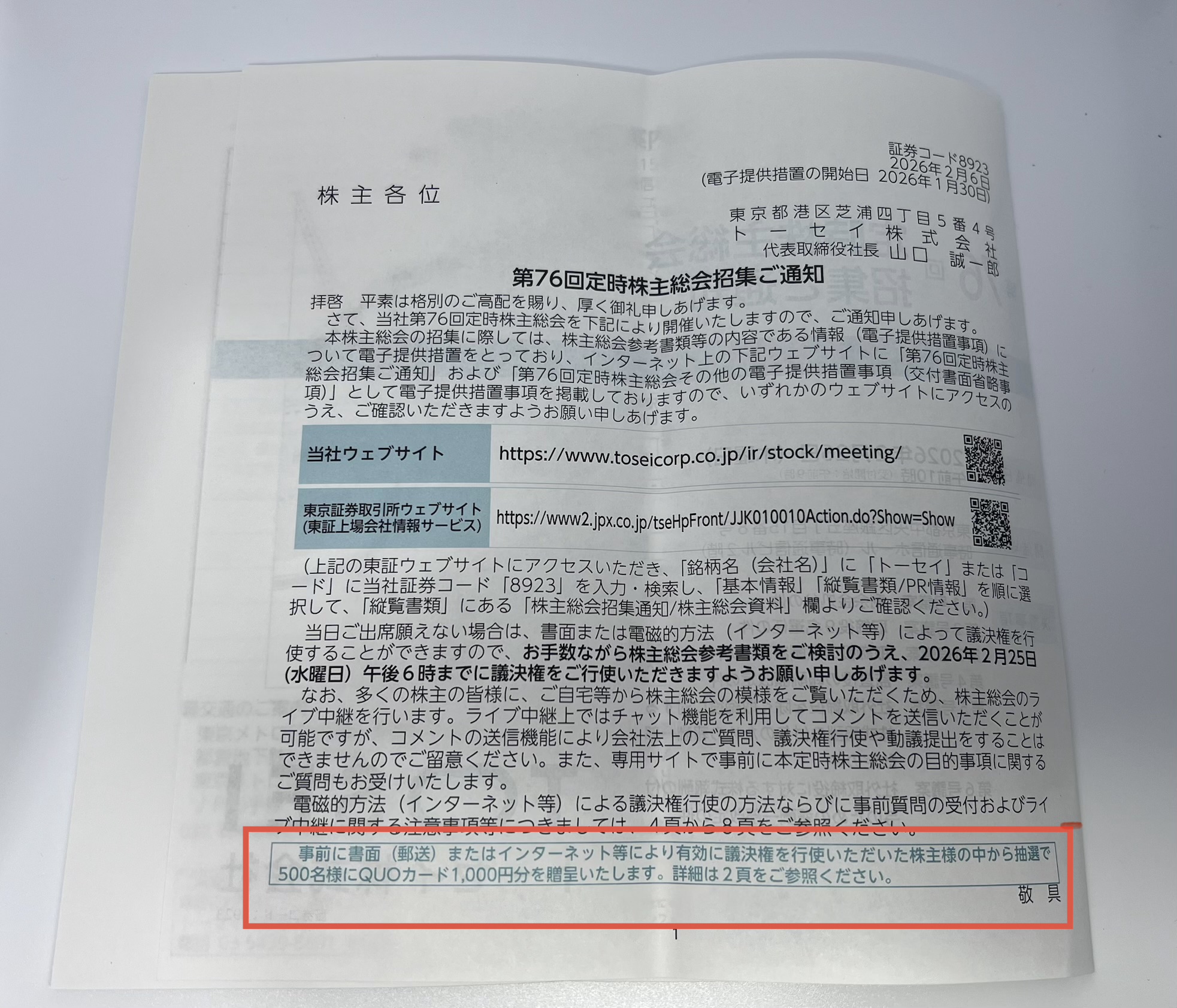 🎁 議決権を行使した株主の中から抽選で500名に、QUOカード1,000円分をプレゼント