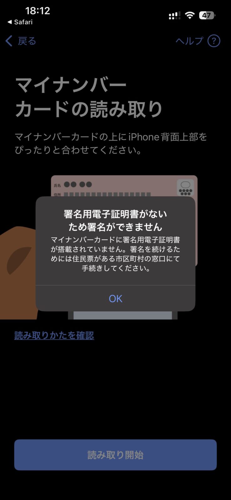 設定したであろうパスワードを入力し、マイナンバーカードをスマホにかざすと、