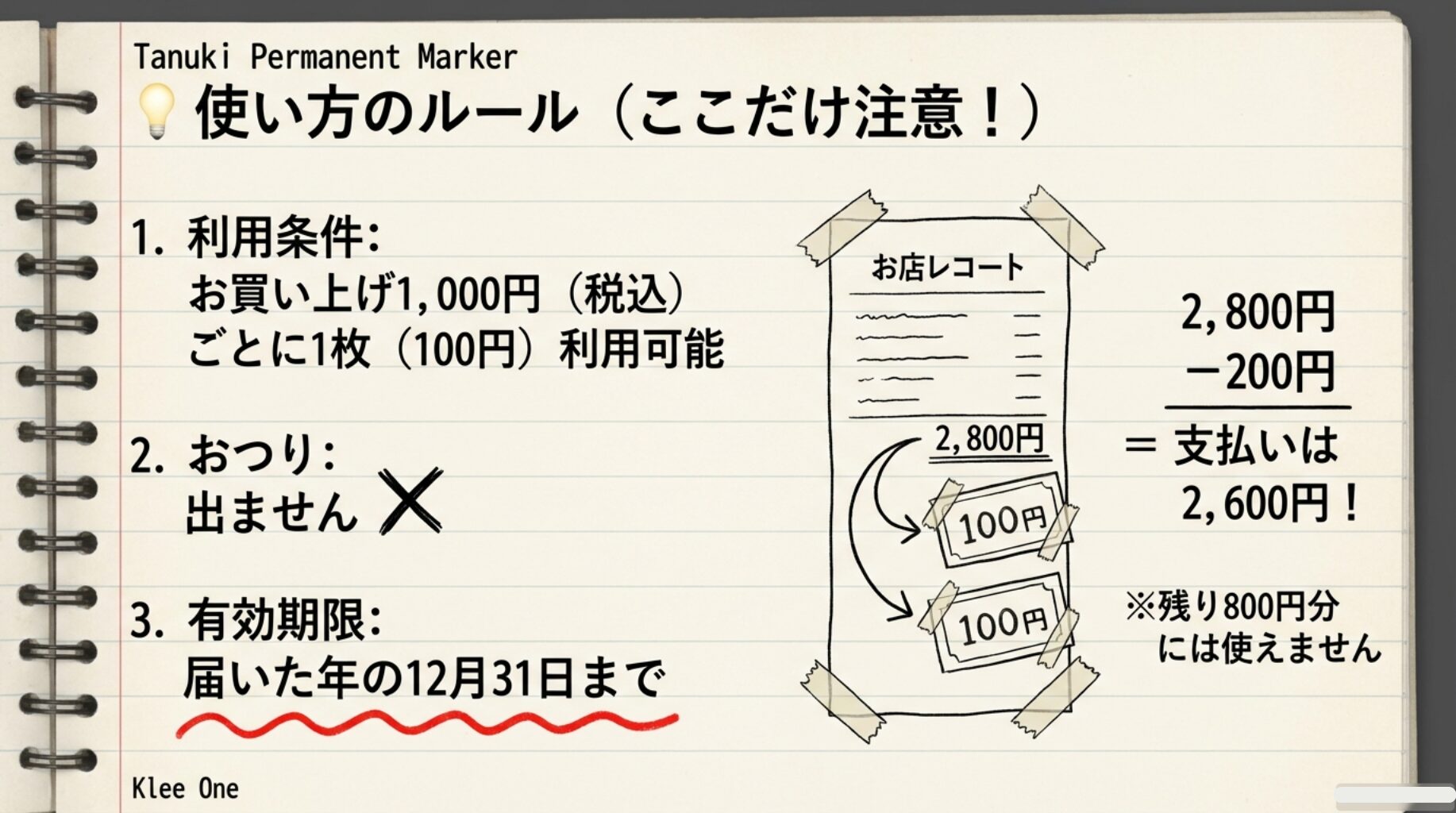 たとえば2,800円分の買い物をしたら、100円券は2枚(=200円分)まで使えます。